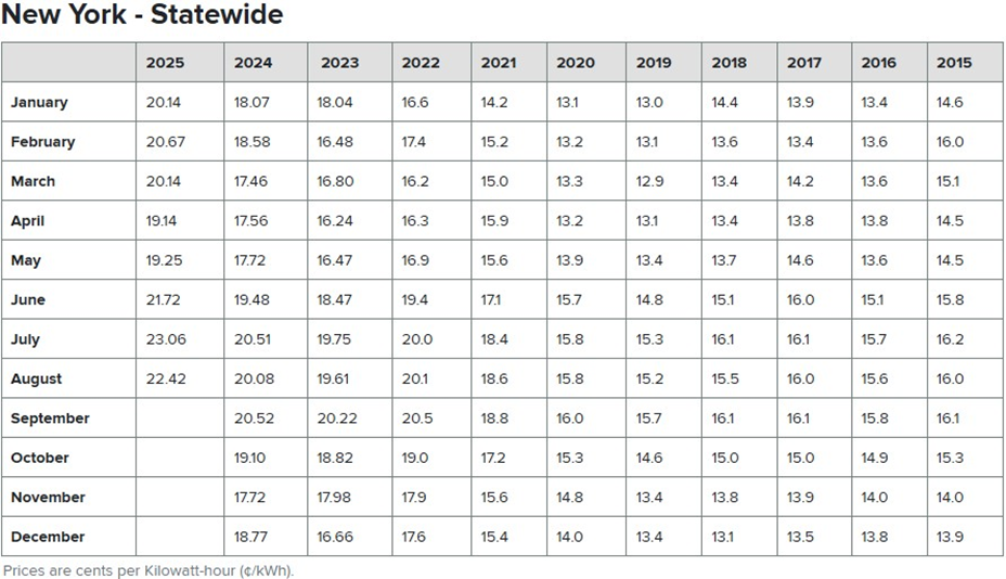 Per NYSERDA’s recent update, the table below presents average commercial electricity prices (in cents per kilowatt-hour) over time. While the exact numbers vary year to year, the pattern is consistent: long-term cost escalation combined with meaningful short-term swings driven by market conditions.